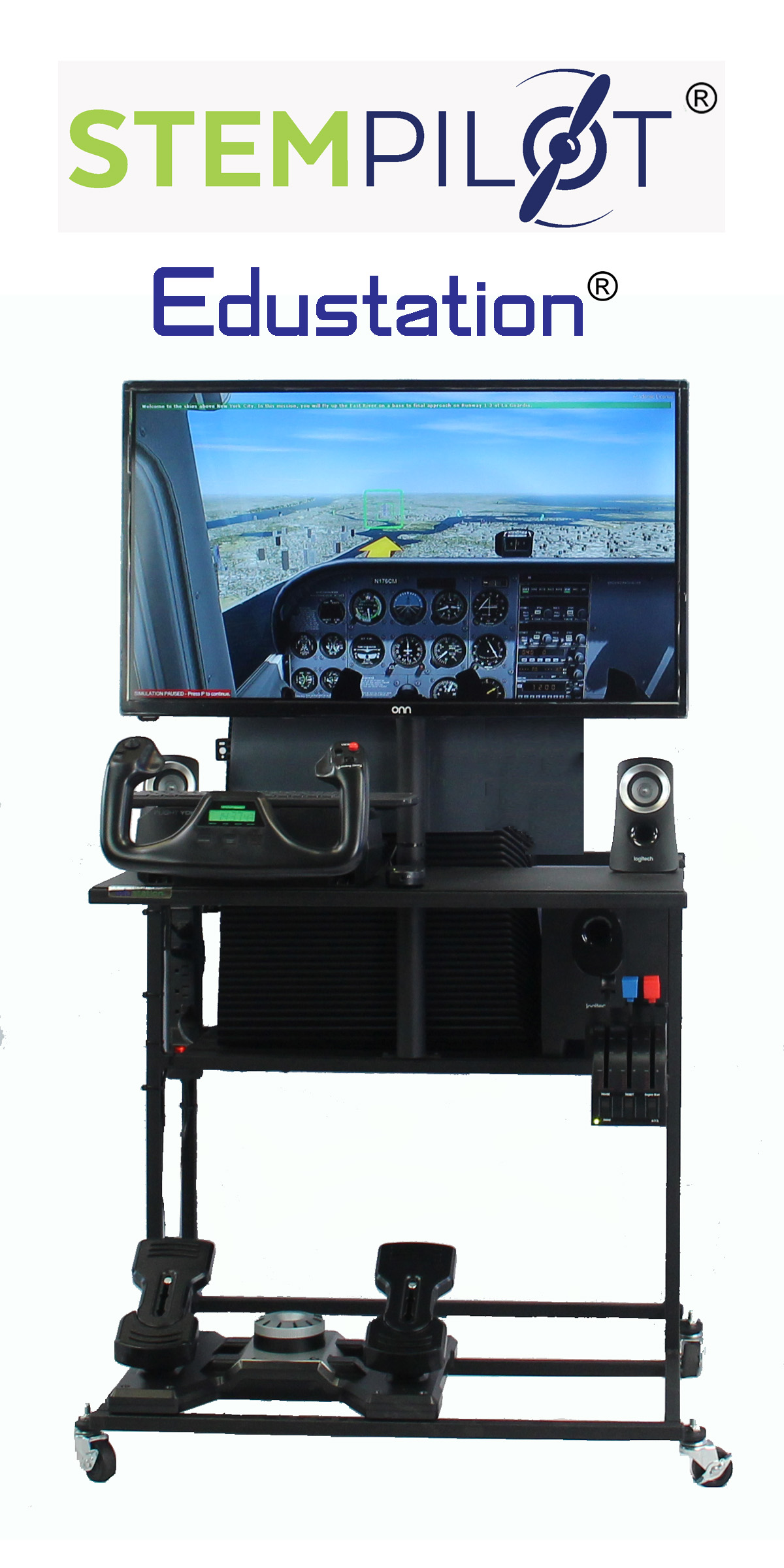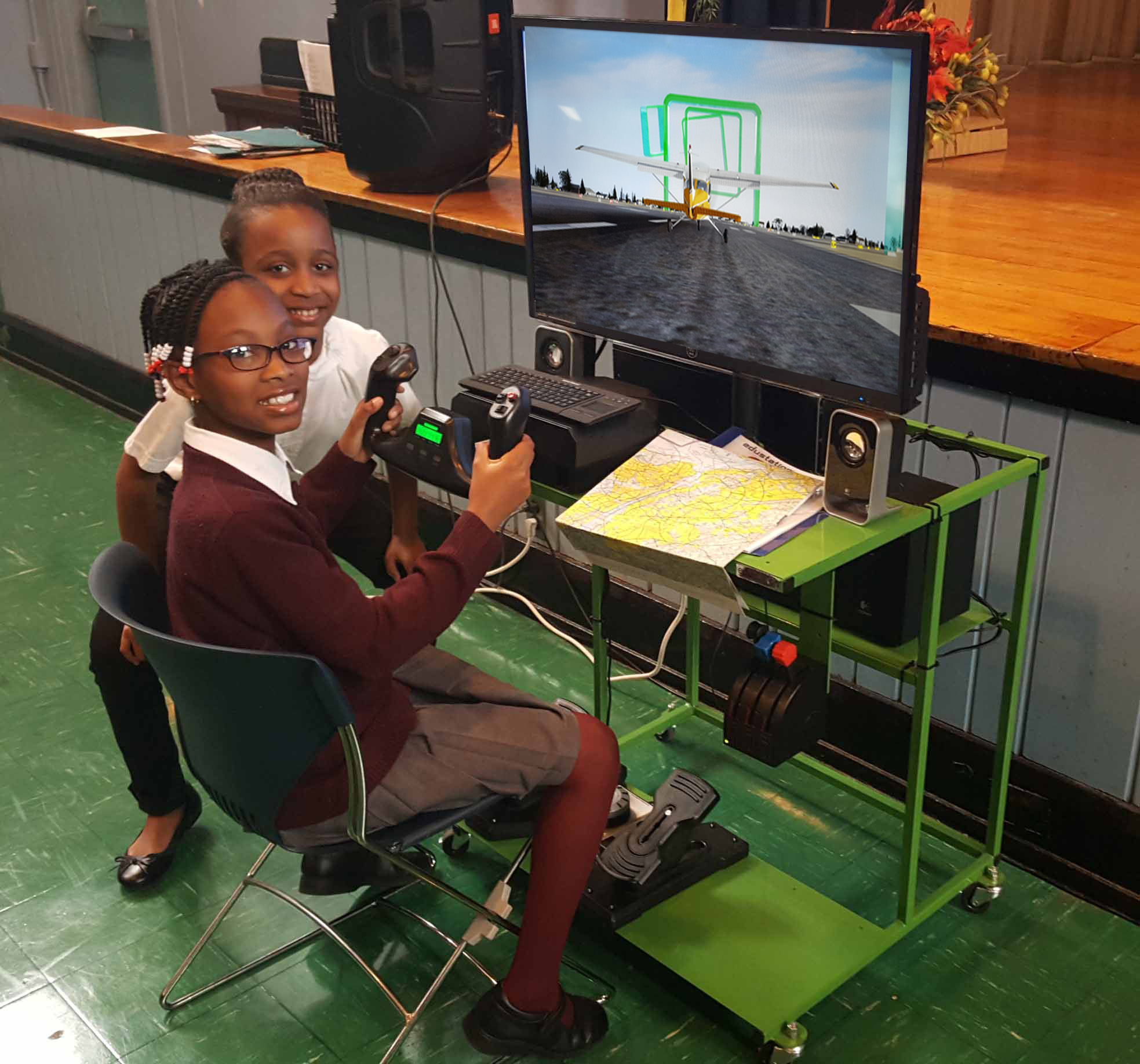 The Edustation flight simulators are capable of flying every airfield on the planet in one of 50+ aircraft. Teachers will use our K12 Curriculum book with NGSS/CSTA/CC aligned multimedia lesson plans smartboard ready, mission learning videos and tutored simulator learning missions teaching all of the fundaments by flying through boxes in the sky.