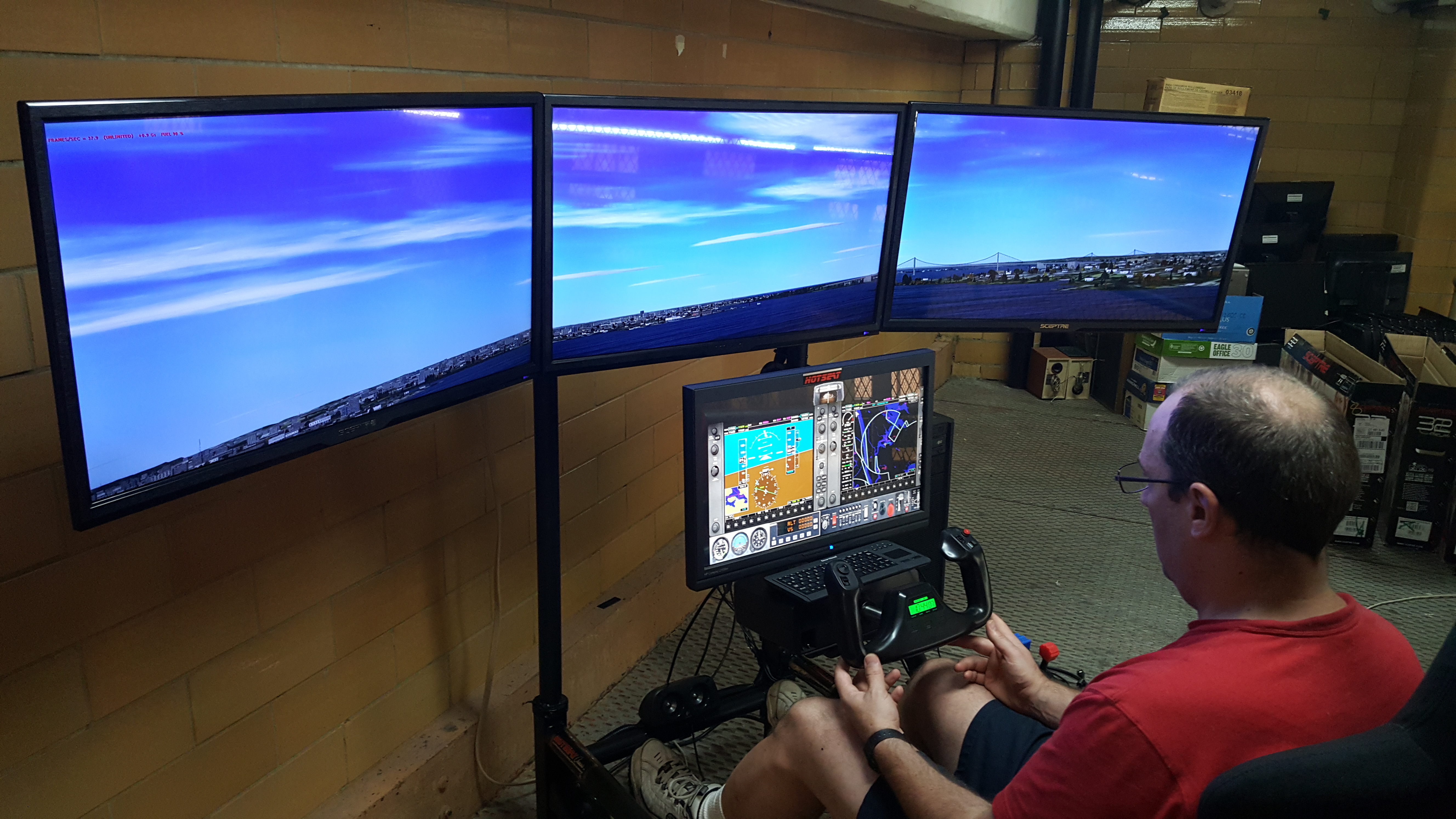 The 90" across Wide Screens deliver a Panoramic forward view in stunning HD, while the lower 22 inch HD screen displays the Instrument Cockpit. The fully adjustable fabric Pilot in Command seat ensures hours of comfortable flight.